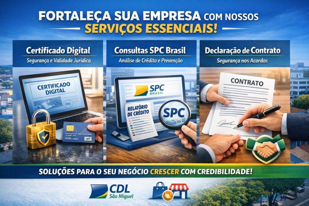 A CDL São Miguel oferece serviços essenciais para fortalecer a segurança e a gestão das empresas locais. Entre eles estão a emissão de Certificado Digital, que garante validade jurídica e proteção nas transações eletrônicas; as consultas ao SPC Brasil, que auxiliam na análise de crédito e prevenção da inadimplência; e a Declaração de Contrato, que traz mais segurança na formalização de acordos comerciais. Soluções práticas que apoiam o crescimento e a credibilidade do comércio da região.